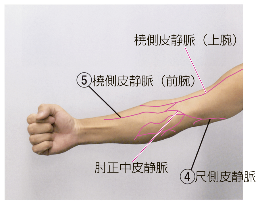 肘内側の尺側皮静脈は、付近を太い神経が走行しているためできるだけ穿刺を避けましょう。