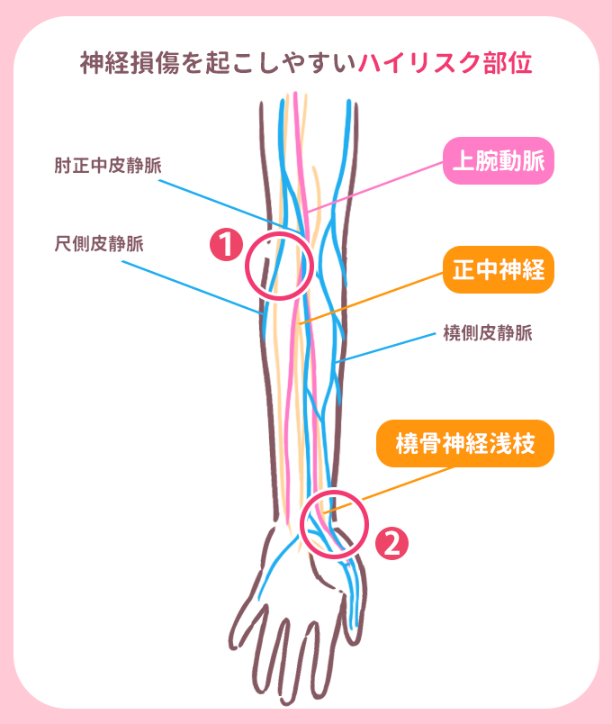 採血しやすそうな血管を見つけた場合でも、血管の場所によっては神経や動脈が近い場所があります。